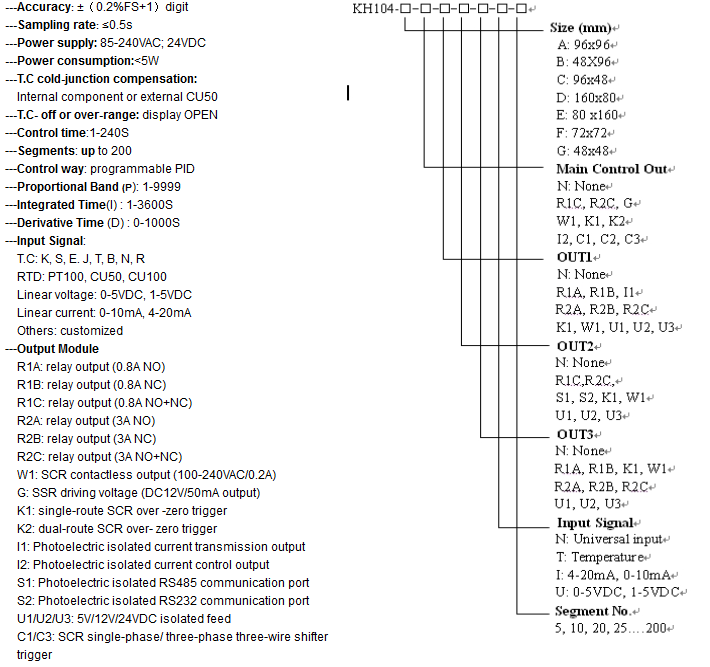 KH104 is a intelligent programmable PID process controller, intelligent PID self-tuning, on-0ff and automatic PID control shifted flexibly, high-accuracy measurement and data acquisition compatible; universal input such as thermocouple, thermal resistance, current and voltage, can measure accurately and control temperature, pressure, liquid level, gravity, instantaneous flow and others; adopts SMT technology, modular structure output functions such as relay, SSR, SCR, auxiliary power supply for sensors output, retransmission, print and communication etc, easy and flexible to configuration. The controller adopts jump order for multi-program usage together, designed for measuring and controlling accurately the specified value with time change.
