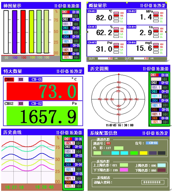 KH300AG智能小型彩色無紙記錄儀(96×96mm最多6通道輸入)具有全隔離萬能輸入功能,集熱電偶信號、熱電阻信號、標準電壓、標準電流、脈沖信號于一體?商峁┩ㄓ、打印、報警、饋電等功能。儀表具有強大的顯示功能,高精度棒圖顯示、實時曲線顯示、歷史曲線追憶、中圓圖顯示、歷史圓圖追憶、報警狀態顯示,同時可直接查詢年、月、日、時、分、秒的數據,快捷方便,頁面刷新速度小于1秒。使用RS232/485通訊,標準MODBUS-RTU協議,可與組態王、MCGS等專業軟件進行組態。數據可直接通過任意U盤導出,U盤即插即讀,無需任何操作;分析軟件可導出EXCEL數據格式或曲線格式,直接打印即可,兩者同時使用或兩者選其一。